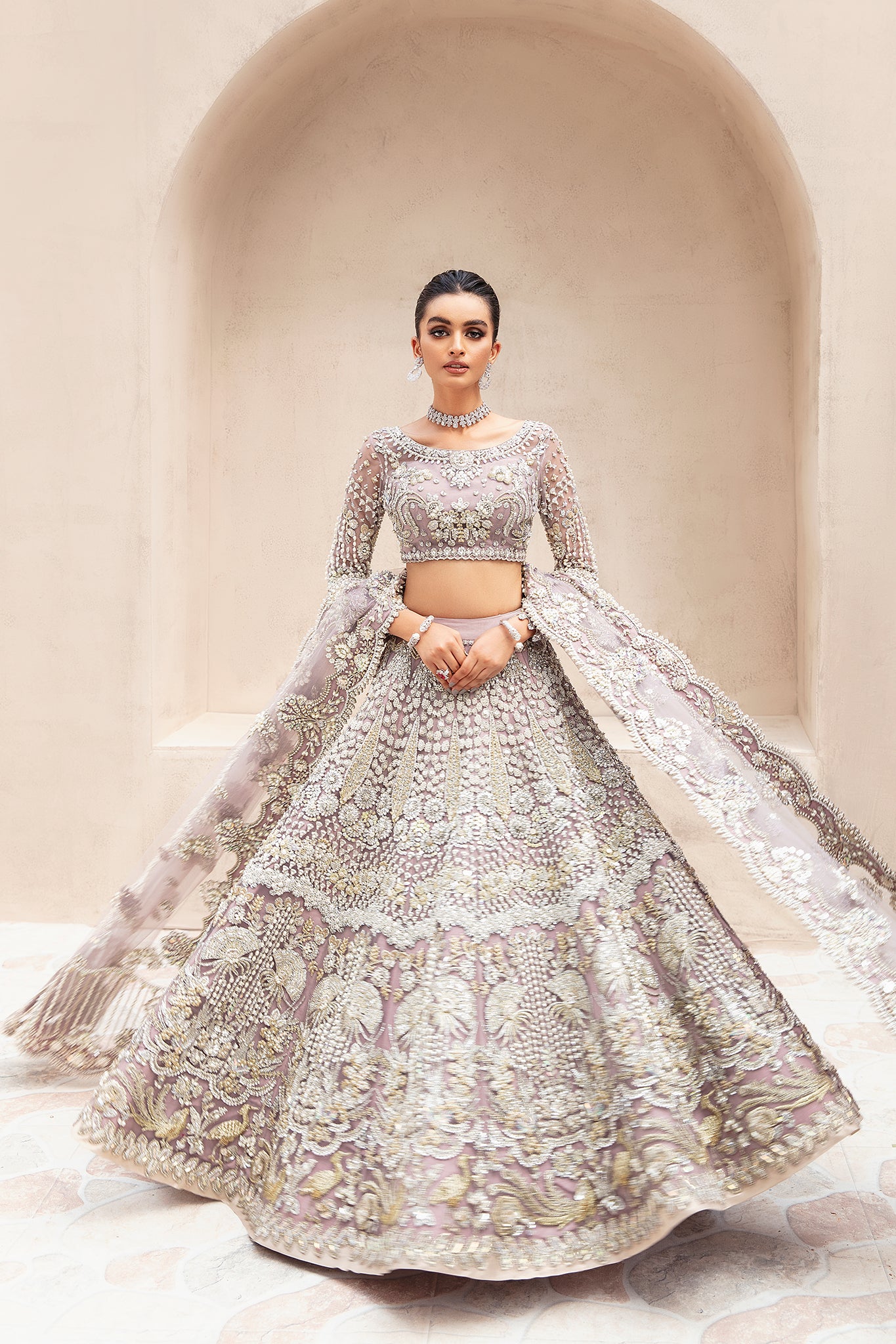 A romantic lehenga choli set crafted on a luxe net fabric dipped in premium blush pink hue. Featuring heavy handwork details, Swarovski crystals, stones and pearls. The look is completed with an organza duppata being an ode to traditional patrimony. The highlight of the outfit has to be the beautiful fitted modern lehnga with sequin and pearl work on its borders , which makes a perfect festive look