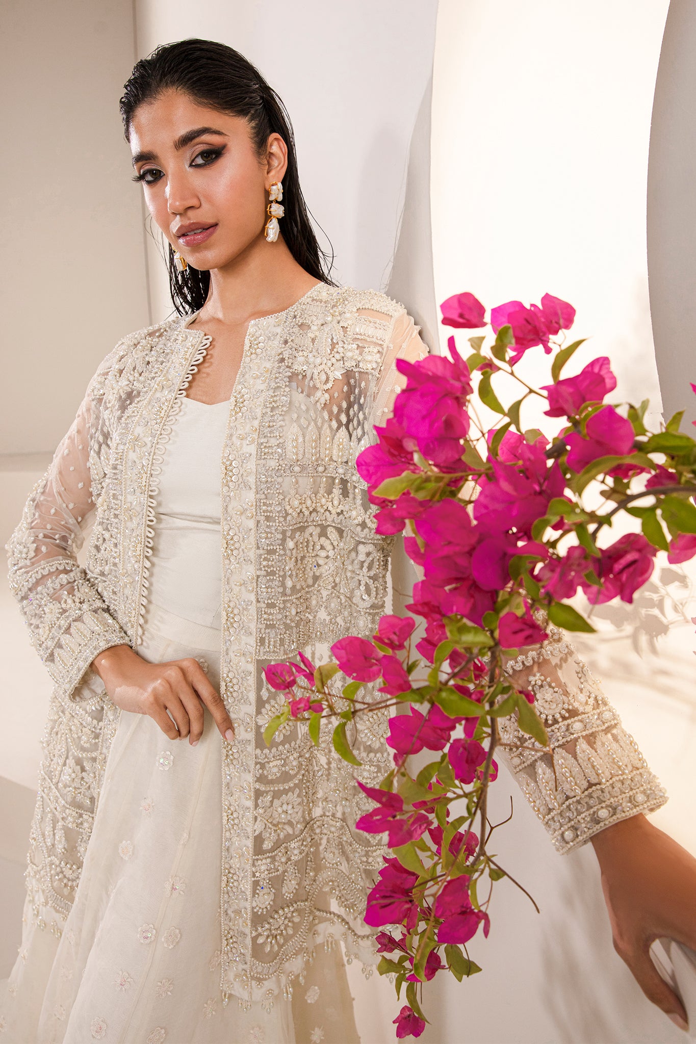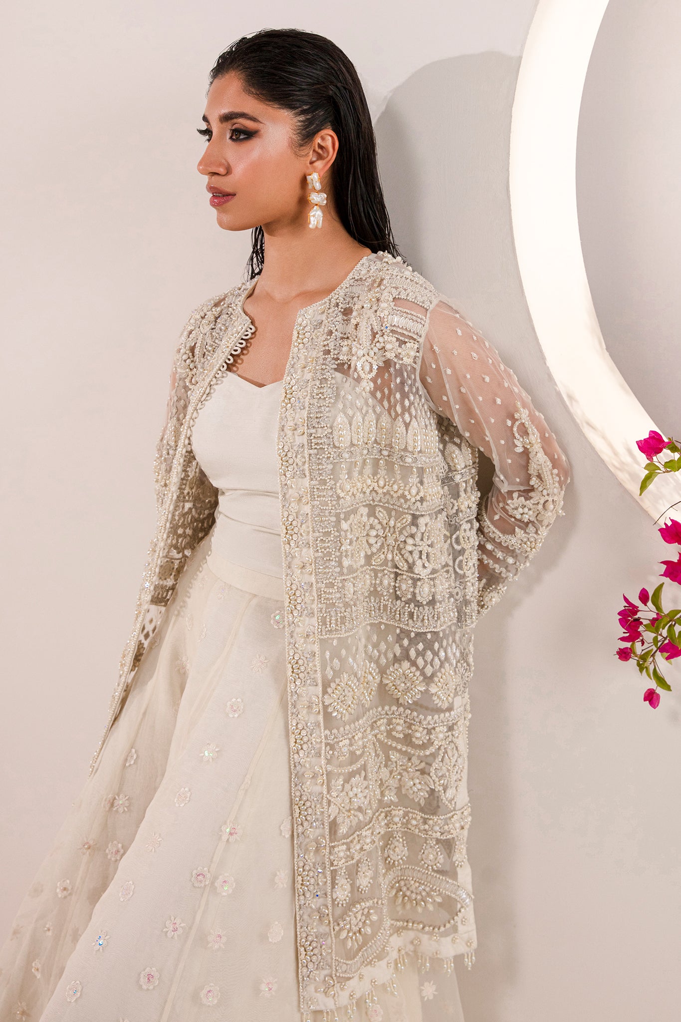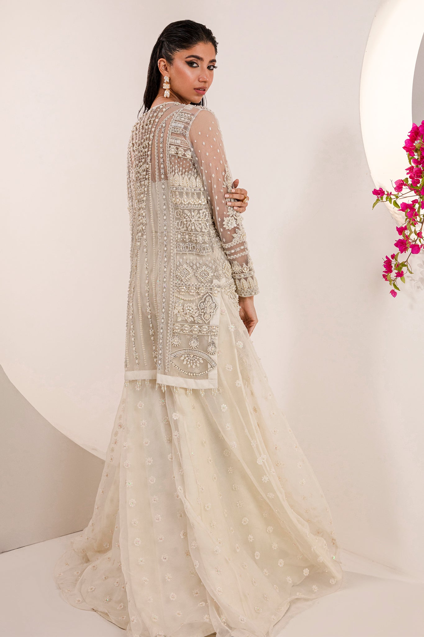 The dreamy and majestic look of this bridal will stand out in this festive season. Made on luxe net fabric, this jacket is enriched with pearls and Swarovski crystals. Combined with white tulle sharara embellished with threadwork motif patterns done by our expert artisans. The silhouette gives a modern twist to this traditional look. The dreamy facade of this bridal can be rocked by anyone.